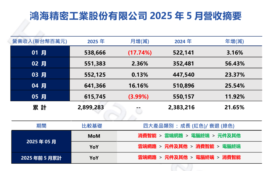鸿海6月5日公布5月销售额6157.45亿元新台币,同比增长11.92%。主要受惠于消费智能产品拉货动能强劲,力抗汇率波动。今年前五个月营收为2.89兆元新台币,年增21.6%,为同期新高。