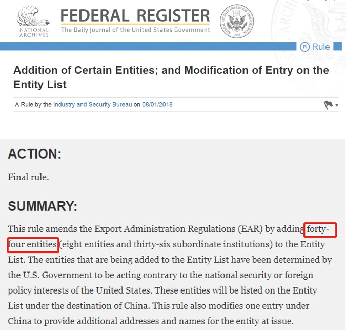 中美贸易战持续升级,美国正式对中国部分企业进行高端技术封锁。8月1日,美商务部宣布,BIS(美国商务部工业安全局)将于美东时间8月1日正式发布,以国家安全和外交利益为由,新增44家中国企业(8个实体加36个附属机构)列入出口管制实体清单,其中包括很多研究机构。