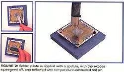 • 在修整出新焊盘之前,小心地刮去新焊盘背面上焊锡点连接区域的胶剂胶结片。只从焊点连接区域刮掉树脂衬底。这样将允许暴露区域的焊接。当处理替换焊盘时,避免手指或其它材料接触树脂衬底,这样可能污染表面,降低粘结强度。