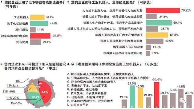 在对100位出口制造业企业主的问卷调研中,发现他们在智能制造设备的认知、使用、投资规划等方面,既存在很多不足,也有许多令人惊喜的地方。比如在问及运用了哪些智能制造设备时,32.7%的受访者表示运用了工业机器人(机械臂),41.6%表示运用了数字化机床;而当问及未来一年投资于引入智能制造设备的预算占总投资预算的比例时,44%的受访者表示比例在1%-10%,32.1%表示比例在11%-20%,可见设备的渗透率还是不错的,对运用这些对生产线进行改造的热情也是比较高的。但从运用的广度和深度看,问卷显示大部分企业还没有习惯于使用智能制造设备。如52.5%的受访者表示公司内部的基础设施、人力等条件还不具备使用工业机器人的要求。同时,碍于成本回报比率和周期的不确定性,许多受访者对运用工业机器人等仍有疑虑,如60.4%的受访者表示工业机器人价格偏高,难以承受,44.6%表示成本回|收周期过长,投资风险大。